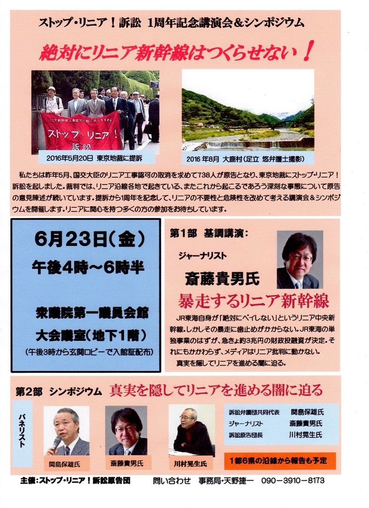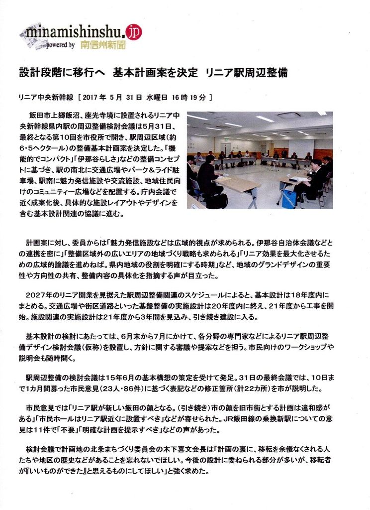 「長野県駅 基本計画案を決定」 (南信Web) 「提訴1周年記念講演」 (リニア訴訟原告団) - 「東濃リニア通信」 <東濃リニアを考える会>